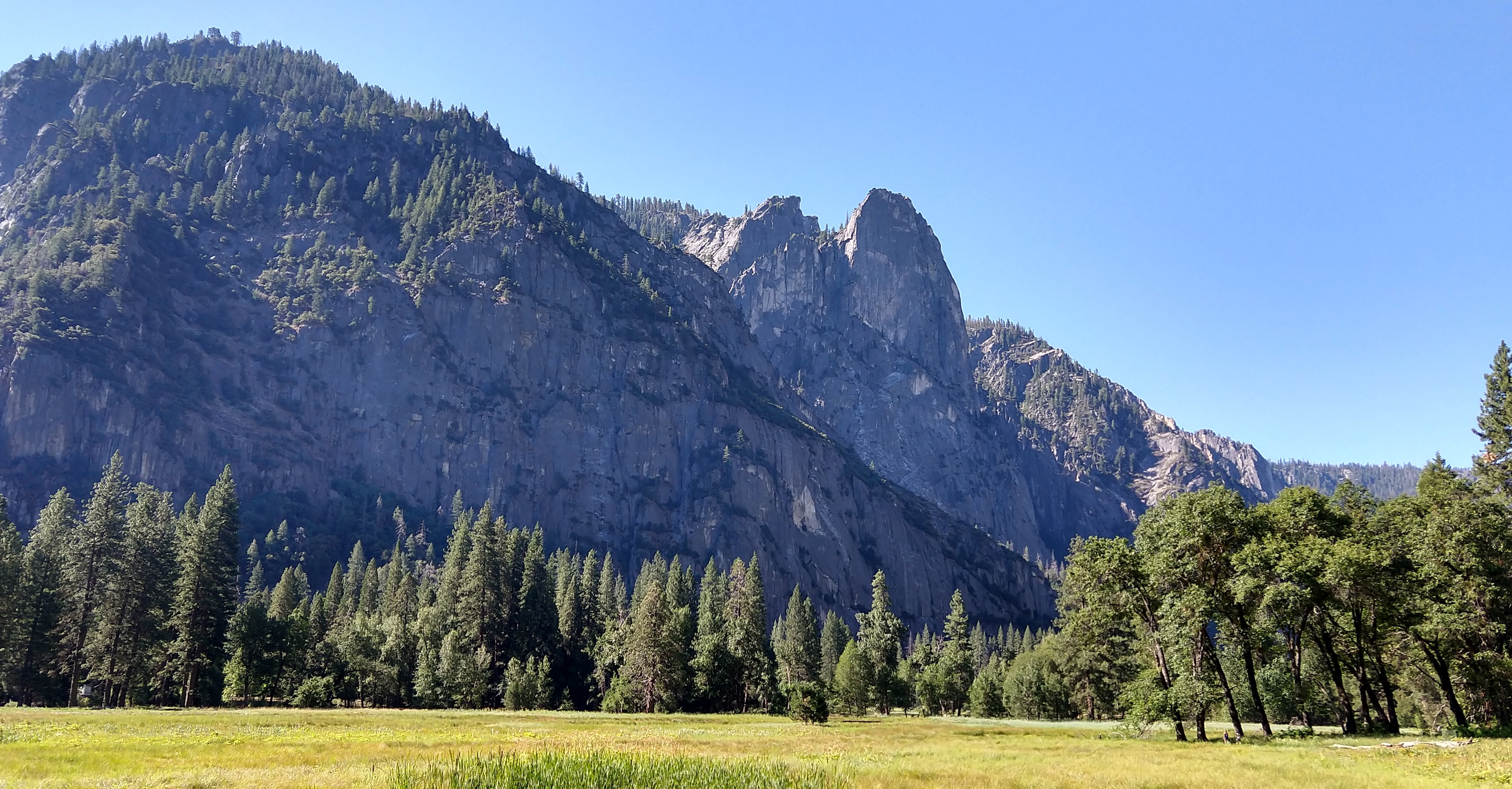 Yosemite Valley is best experienced some distance from the roadside in my opinion, but it’s fun to stop off the road to take in the sights. And if you want to do Yosemite in a day, then hitting up stops on the drive in or out is a good way to take in some extra sights. We stopped at a few places as we left the park, just as the sun was beginning to dip and parking was freeing up a bit. We stopped below El Capitan, and if you have a good pair of binoculars, you might try to spot climbers slowly making their way up the wall. (In my younger climbing days, I had dreams of scaling these walls, but life, and a progressive – or healthy depending if you listen to my wife – fear of heights, brought me in another direction.) If you get lucky, you might also spot a heard of elk grazing in the nearby meadows.